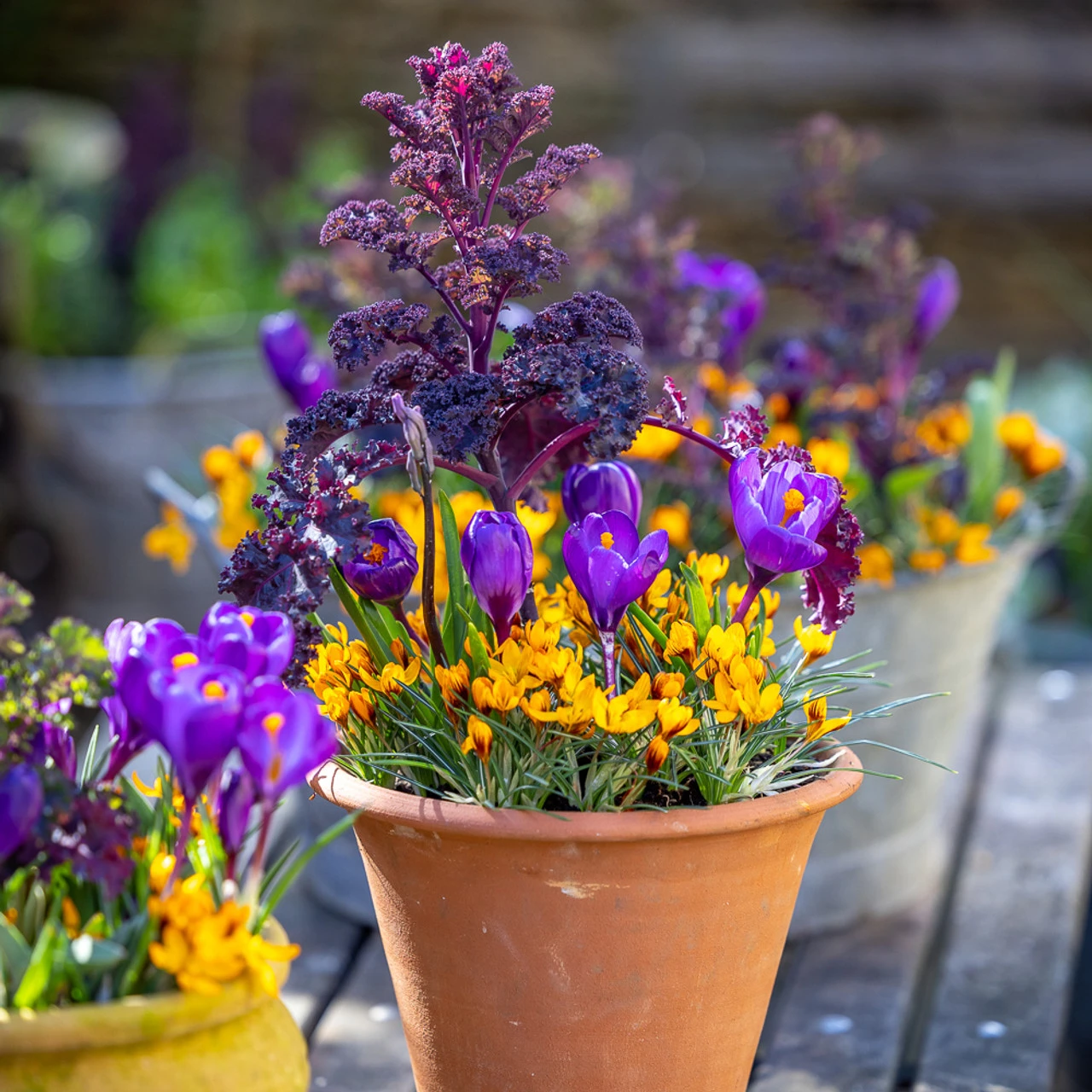 Make sure your zinc baths and pots create maximum impact with this marvellous mix of crocus in Arthur’s Flower Yard. At Perch Hill, the crocus surround bonsaied seedlings of Kale Redbor with tulips coming next.