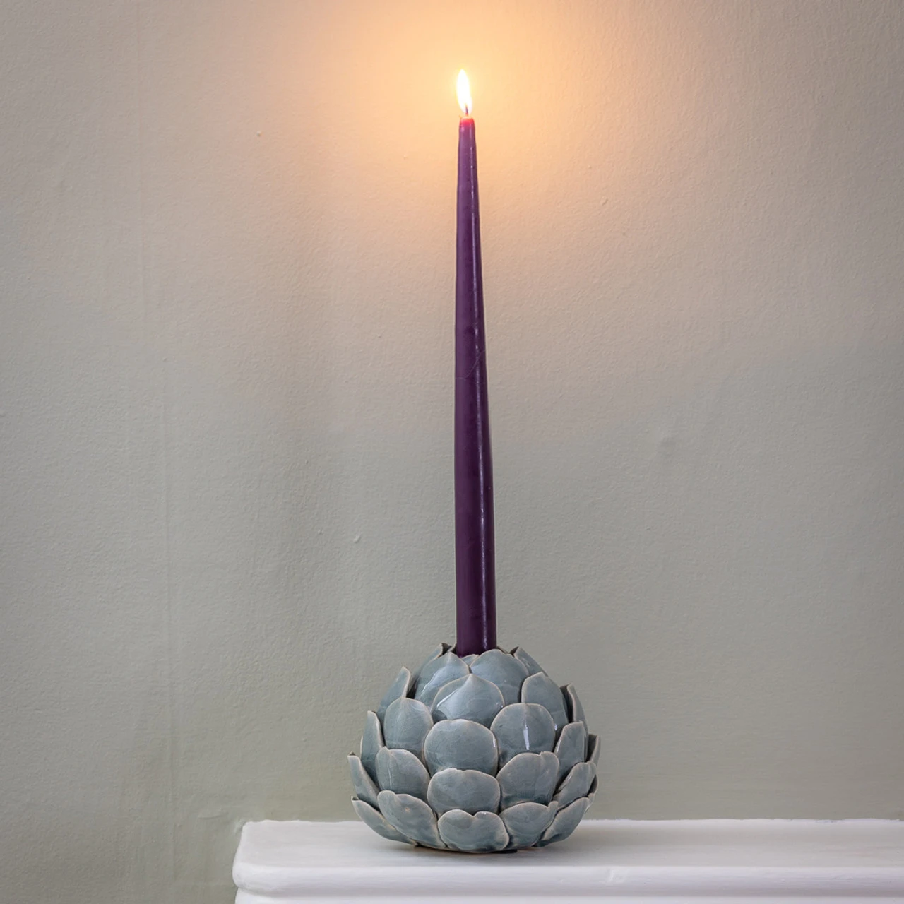 A beautiful, classy ceramic artichoke candleholder in a silvery blue glaze. Looks brilliant both on a table or on a mantel. We think this makes a perfect present too.