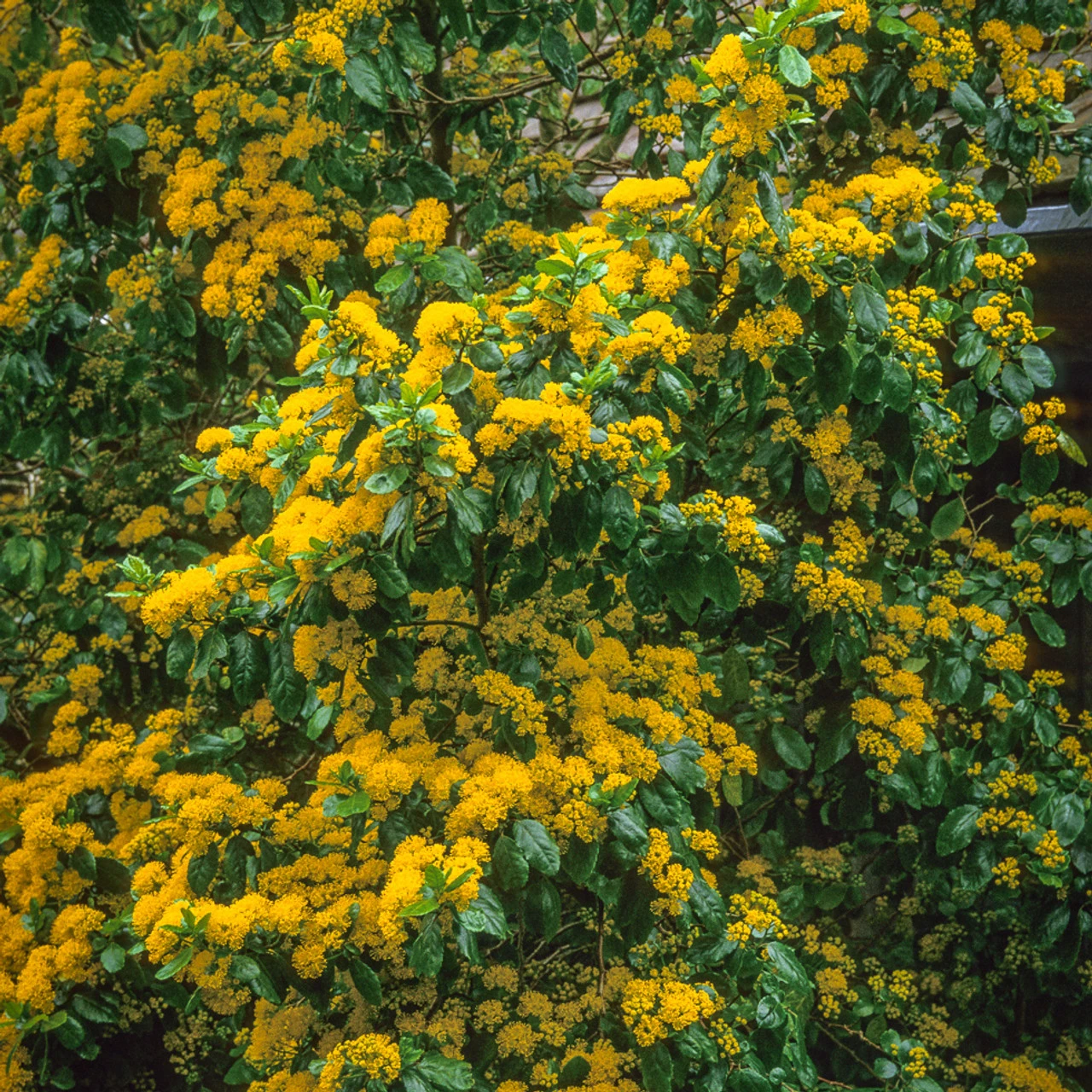 Tremendously popular with the bees and the butterflies, glossy evergreen foliage gives way to vibrant yellow clusters of marzipan-scented flowers.