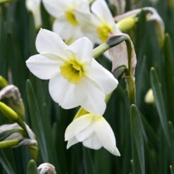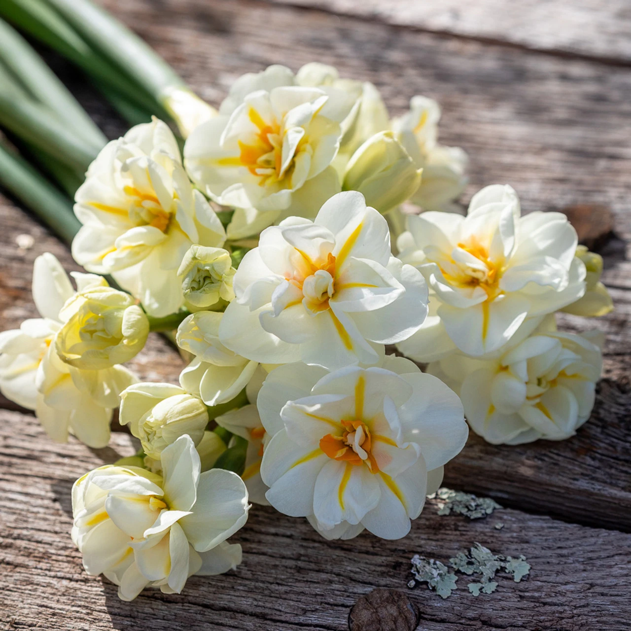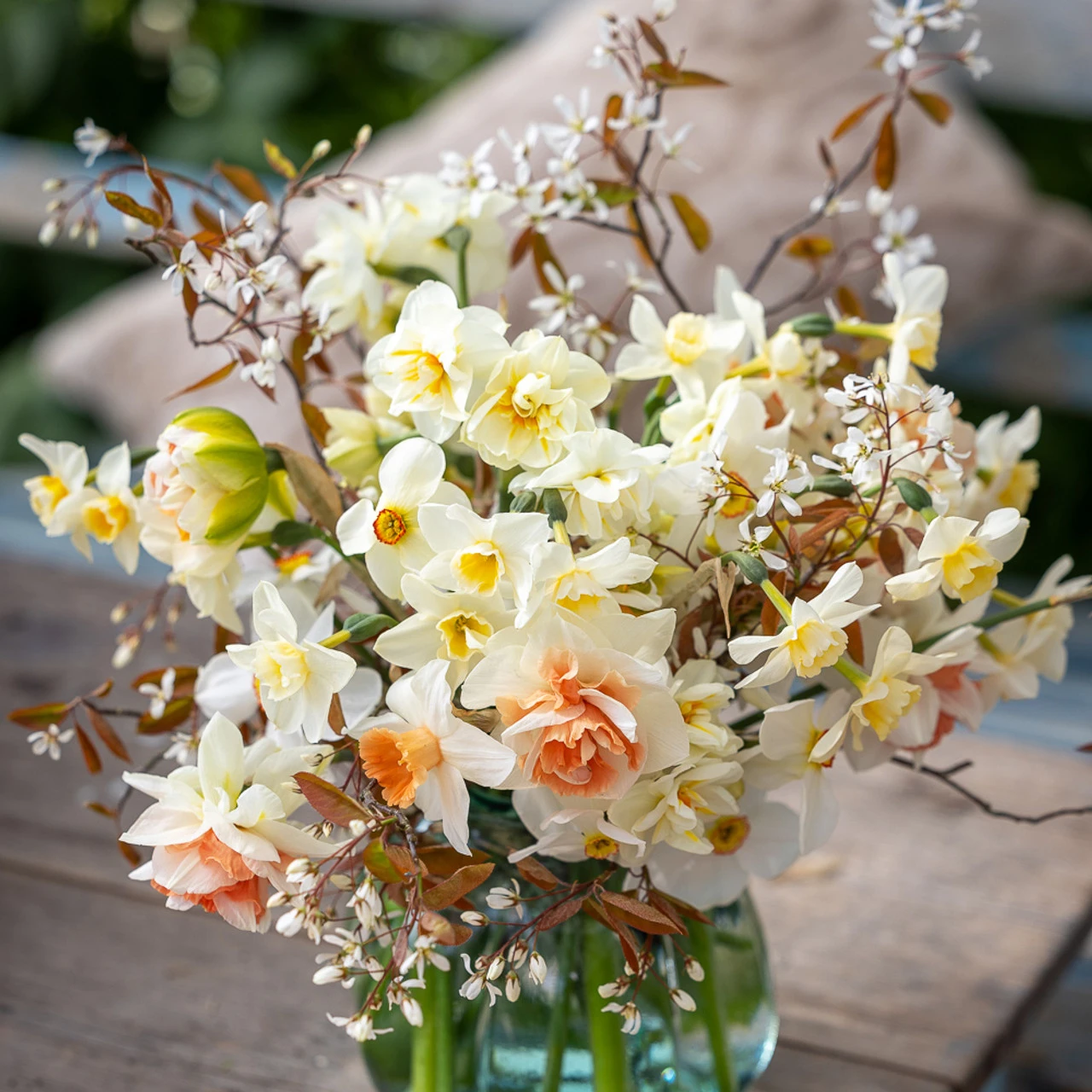 Soft, romantic, scented and pretty — the loveliest selection from our narcissus for cut flower trial. Arranged here in our pumpkin vase with amelanchier (as pictured) just as they are planted in our Dutch Yard.