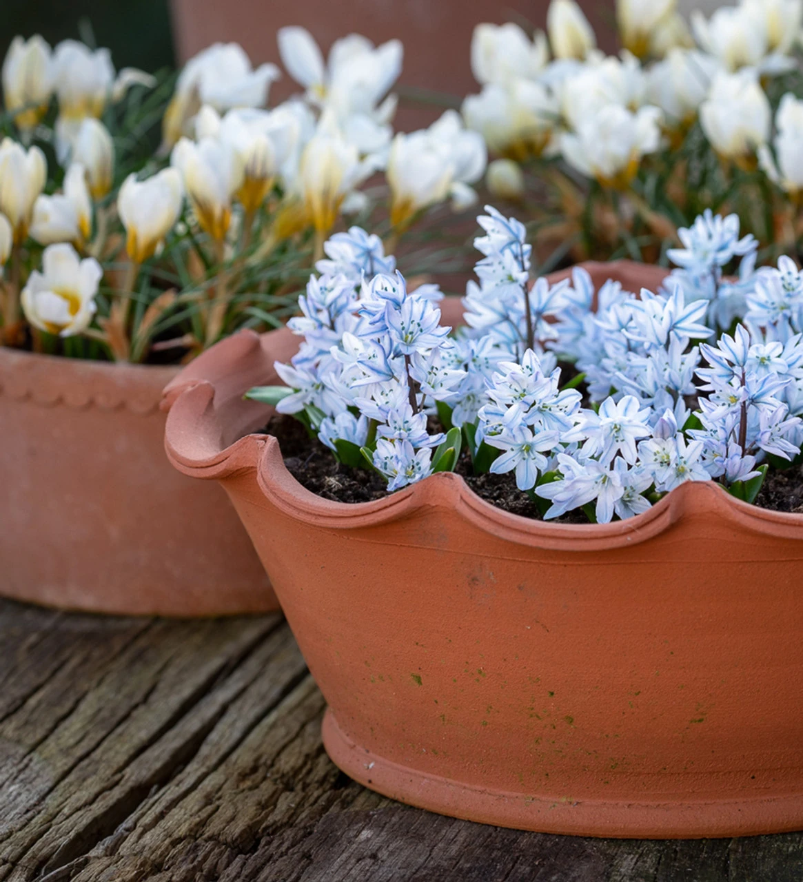 Our first February flowers, a scented crocus and ice-blue scilla. They tend to get muddy in our wet Februarys growing in the ground, so look their best crammed into a pot as tight as you can and put up on a table or plant theatre as a stage.