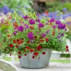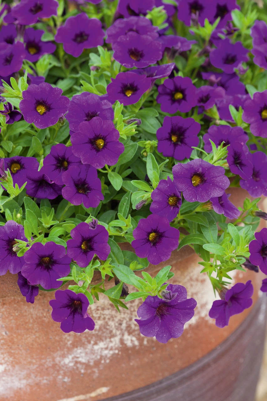 Like a miniature flowered petunia, Calibrachoa ‘Cabaret Deep Blue’ flowers look like they’re cut from velvet, to tumble out over the sides of any pot, large or small.