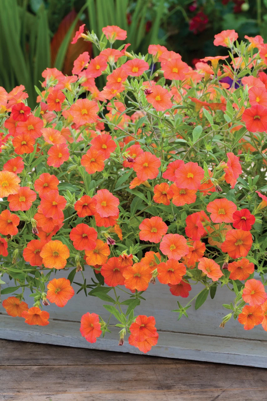 Calibrachoa ‘Can Can Orange’ is a magnificent colour and almost perpetual flowering plant. I love this trailing out of a pot on its own or contrasted to the felted silver leaves of Plectranthus ‘Silver Shields’.