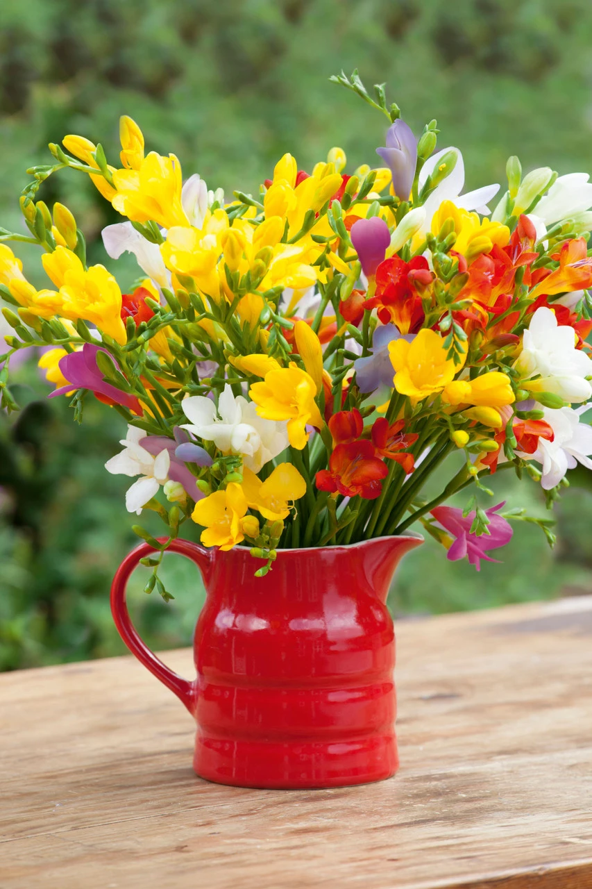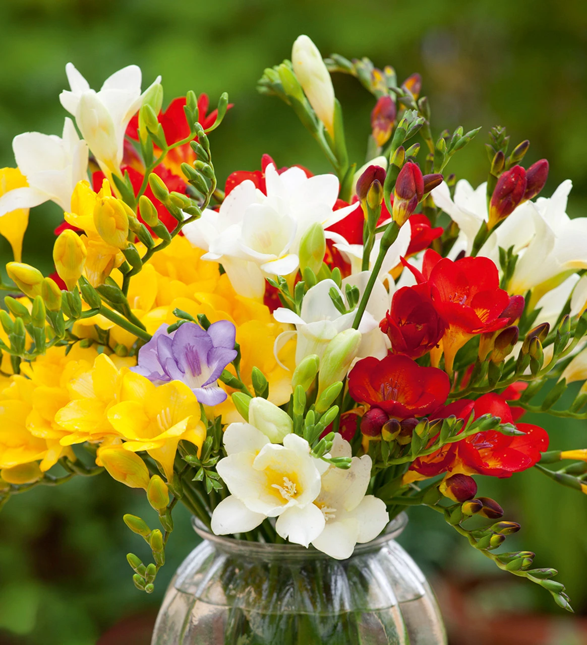 If you don’t have a particular colour scheme in mind – go for a mix of all of these freesias and get the best of all worlds. A classic highly perfumed, zingy coloured jumble including white, yellow, red, pink and mauve freesias.