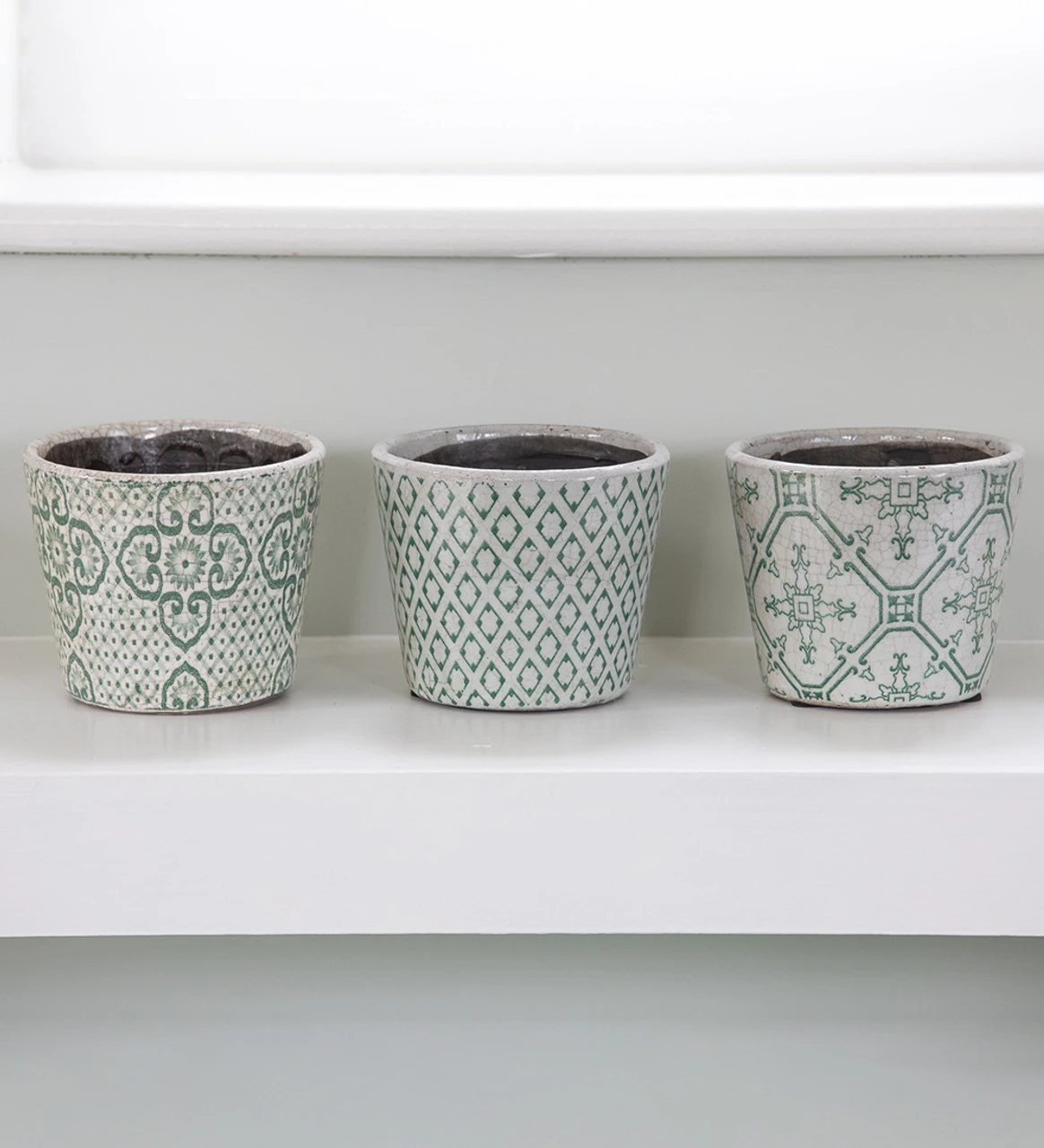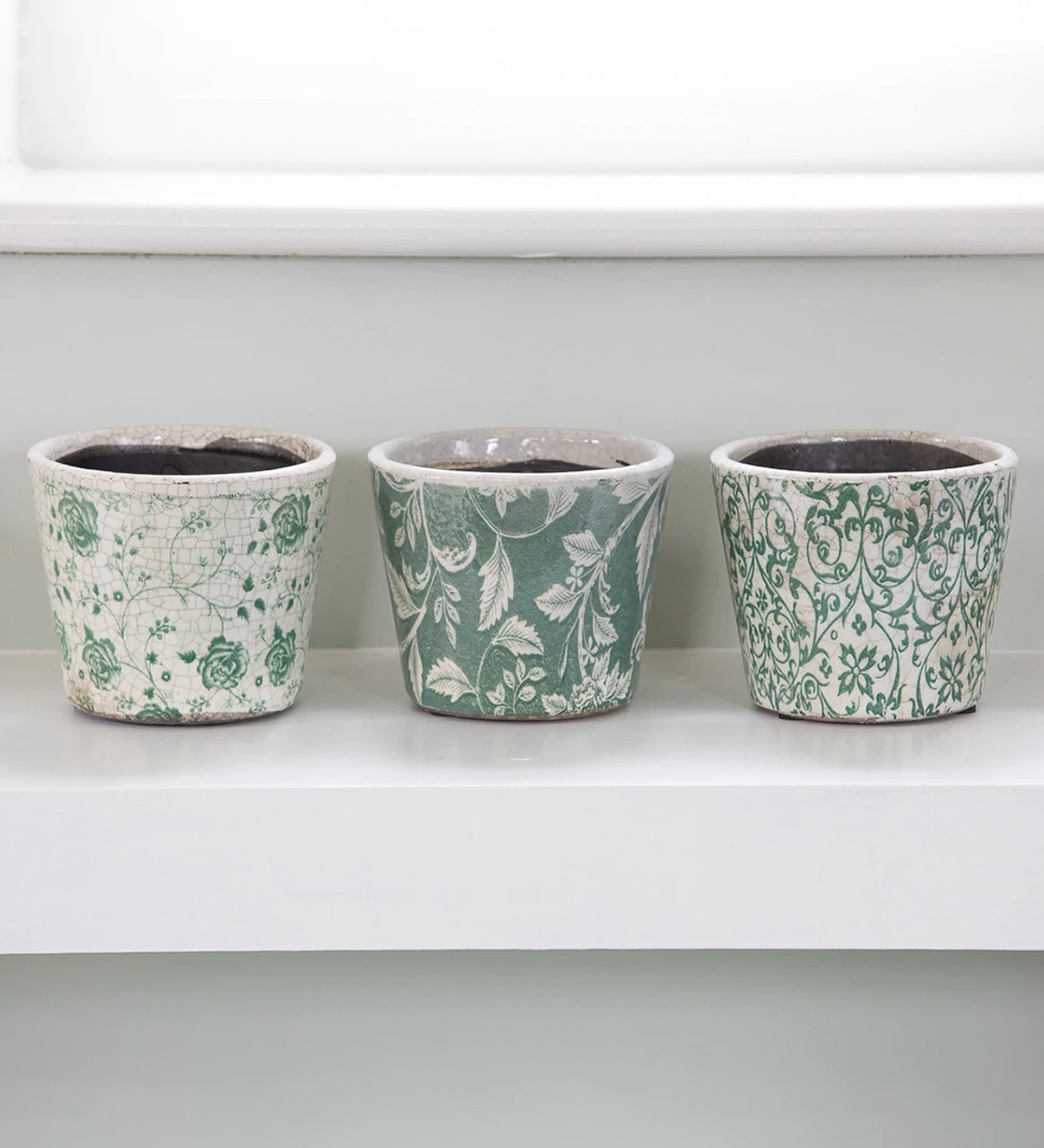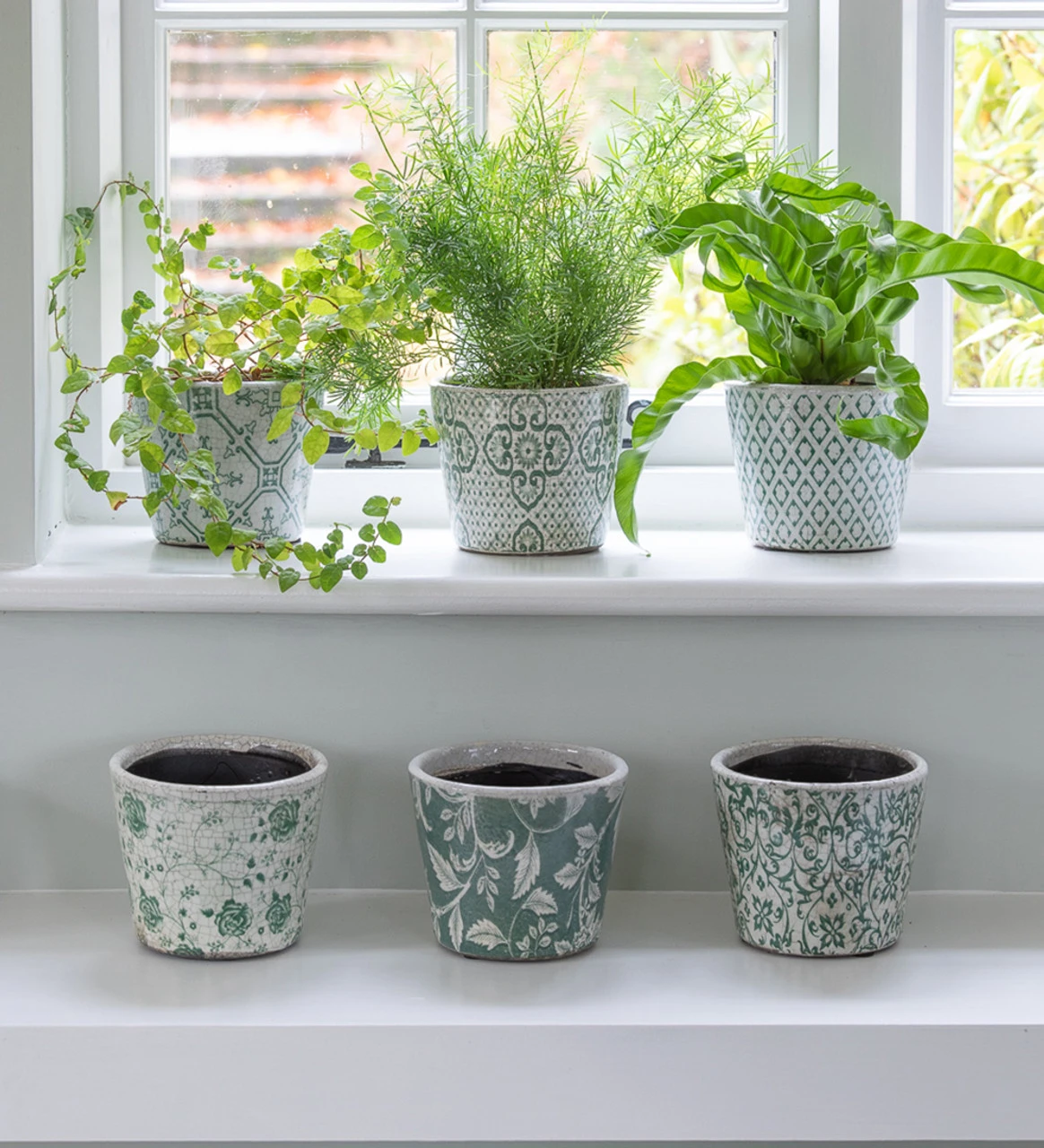 Our pretty, vintage-style patterned pots have a rustic, aged appeal. Group them on a sunny windowsill or place on a plant theatre in the porch or conservatory.