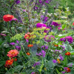 Like spinning plates of gloriousness, a pair of the most prolific, brilliant-coloured zinnias, standing above the jewel flowers of verbenas and Mexican marigolds, all threaded through with plateaux of dill.