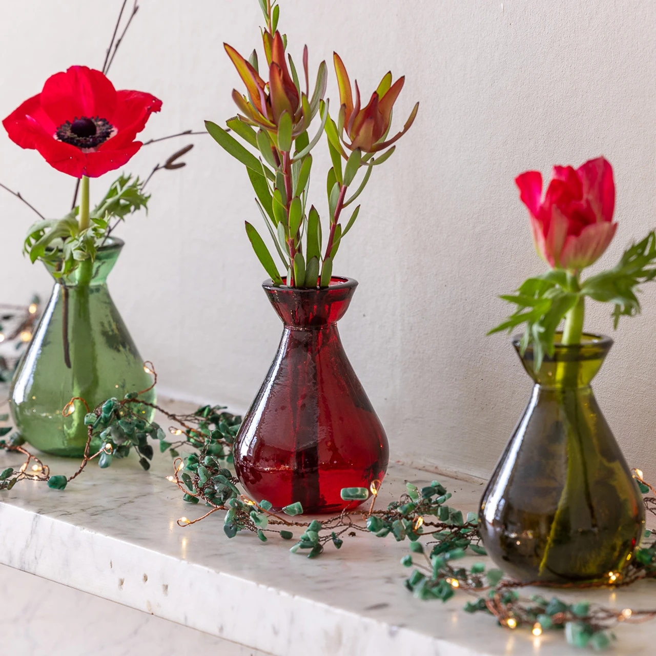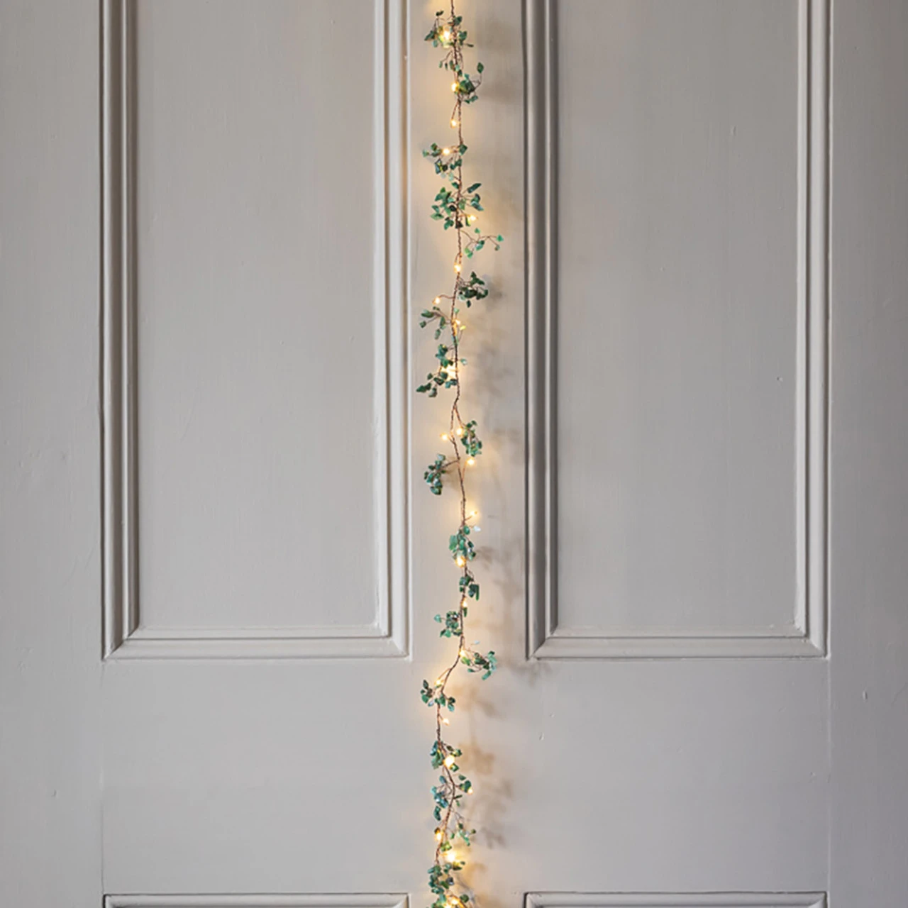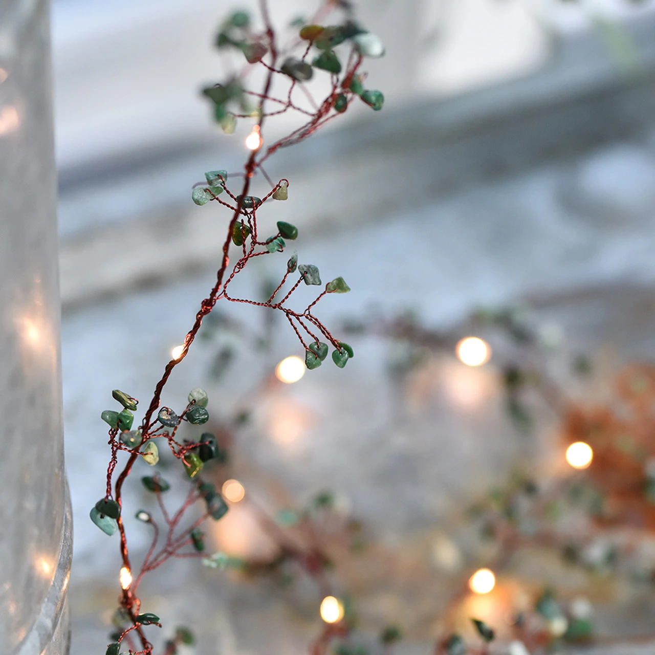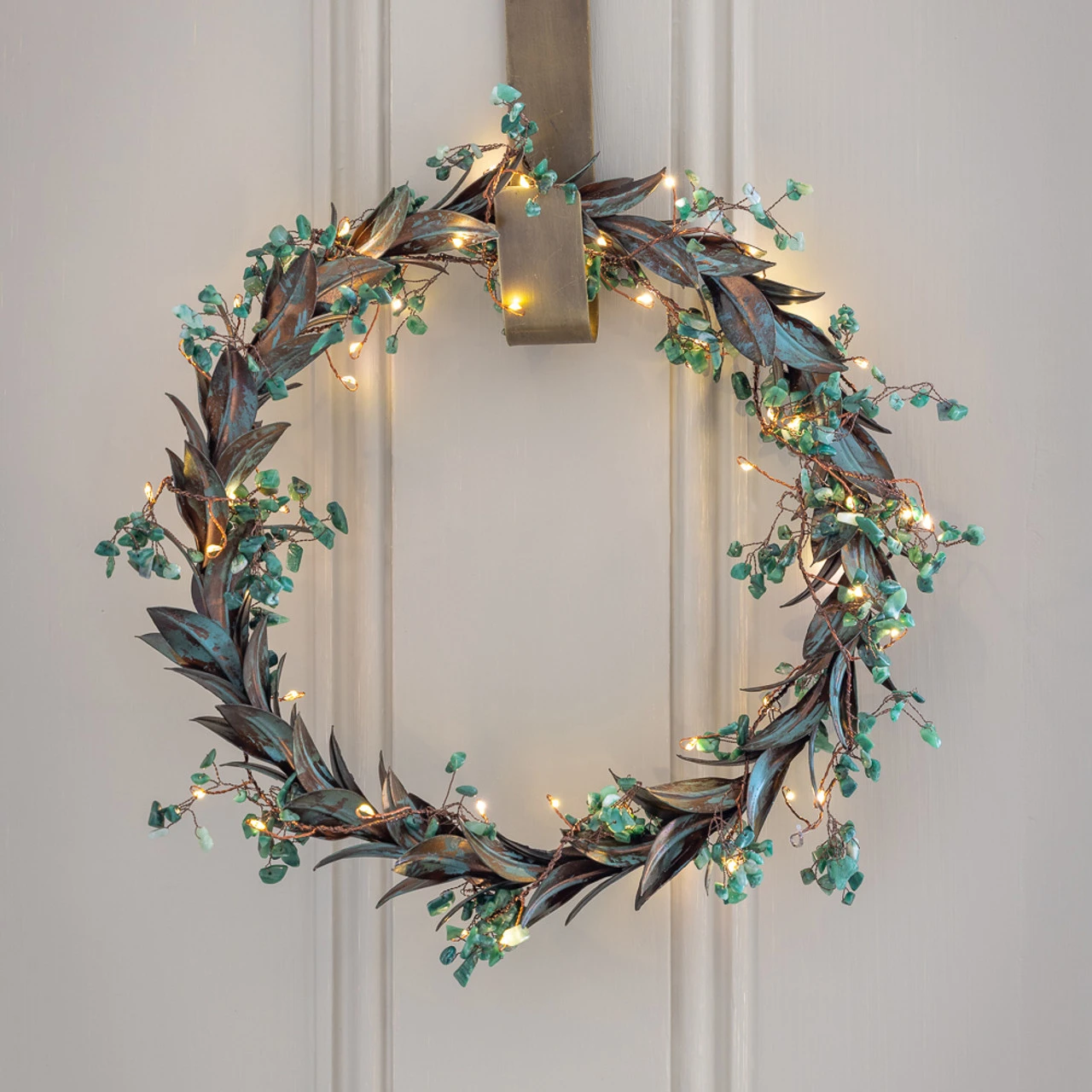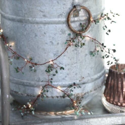 - To recreate this look, simply twist the Jade Gemstone Lit Garland around our Vintage wreath of leaves.
