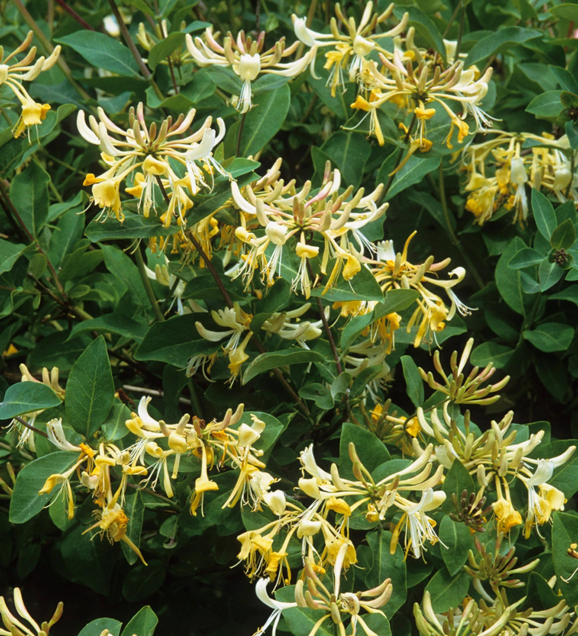 An easy-to-grow and fast establishing honeysuckle with pale creamy yellow flowers with a fabulous evening scent. Grows well with other honeysuckles and climbing roses and will happily scramble over low walls, arches or pergolas. A mecca for pollinators with its abundance of nectar in summer, then in winter, while the berries are an important food source for hungry birds.