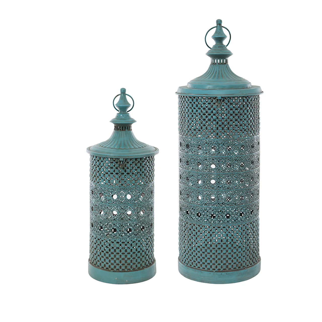 We love this impactful teal Marrakesh Lantern Set! We have paired ours with the Huge Battery Pillar Candles. The large size and intricate design cast beautiful patterns of light all around, creating a warm and inviting atmosphere indoors or out.