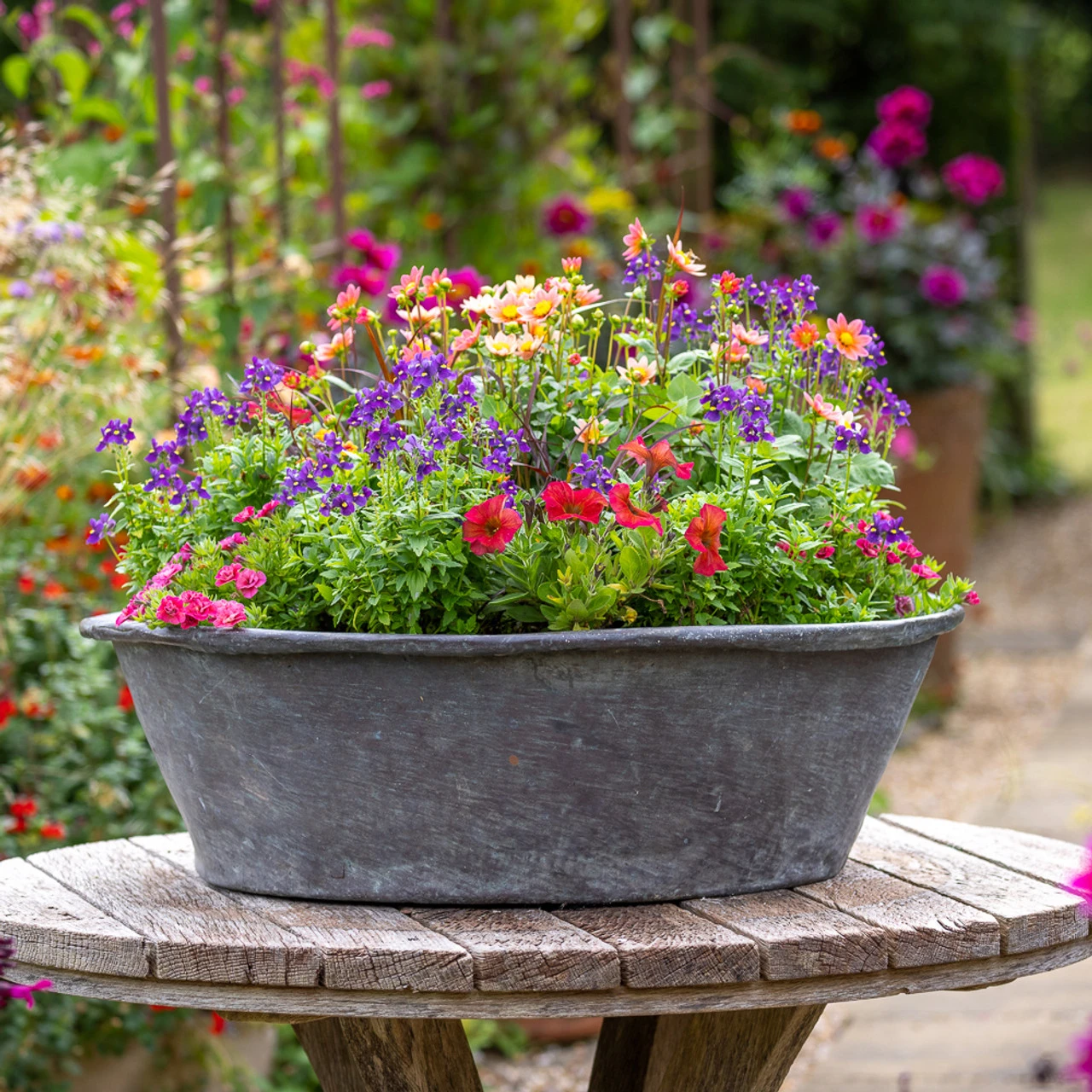 I love a low-growing huge pot on the table for the centre of the cutting garden and this was one of my favourite combinations. Like a stained-glass window, it dazzled — and delighted me – several times a day and did so on minimal TLC.