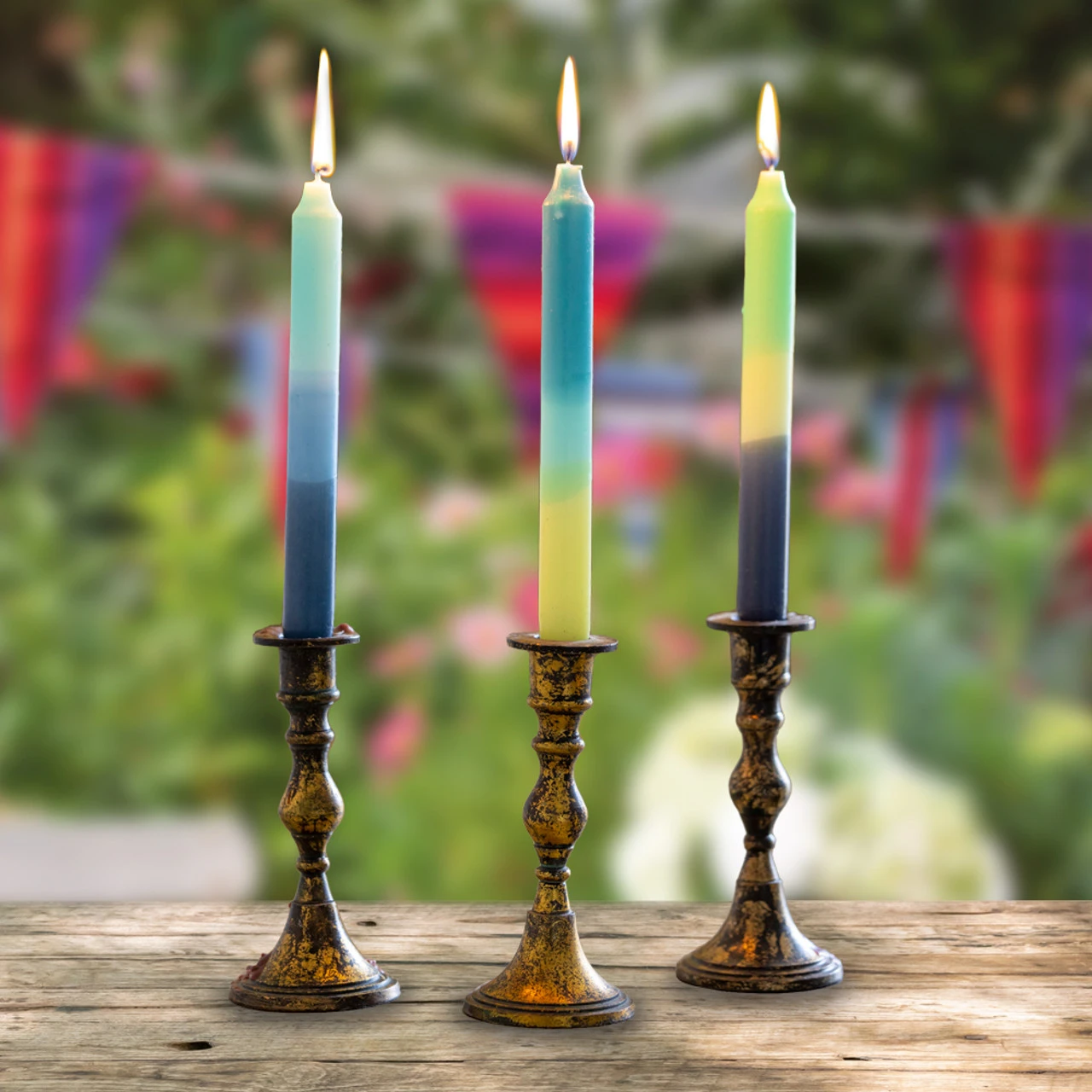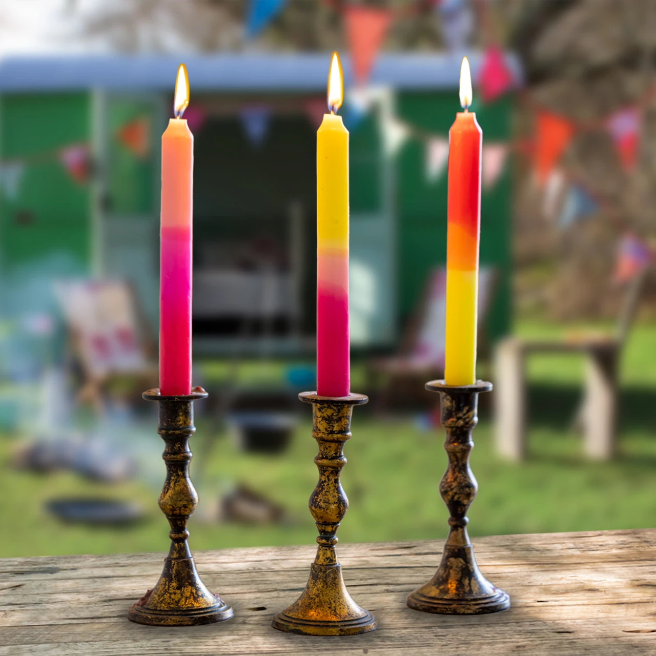 These Ombre Dinner Candles make a striking statement on the dinner table or mantlepiece. Packaged as a set of 3, each candle showcases a 3-colour ombre design and has a burn time of up to 7.5 hours each. Collect both sets for ultimate impact.