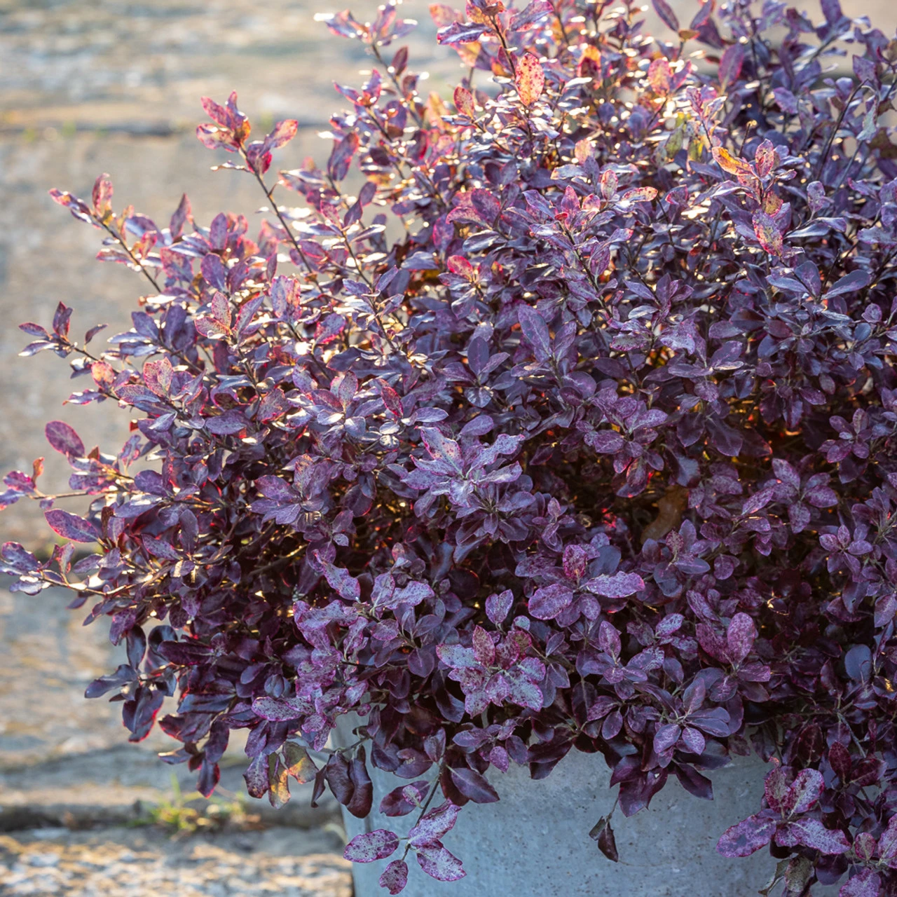 One of my new favourite plants — a neat and compact evergreen, that looks sensational all year round with fine, rich crimson and very pretty leaves. We’ve had ‘Bannow Bay’ growing in a pot since last autumn and it changes colour from season to season, with me picking little sprigs for our kitchen table flowers regularly all through. It also produces small, bell-shaped deep mauve flowers that have a distinctive honey-scented perfume.