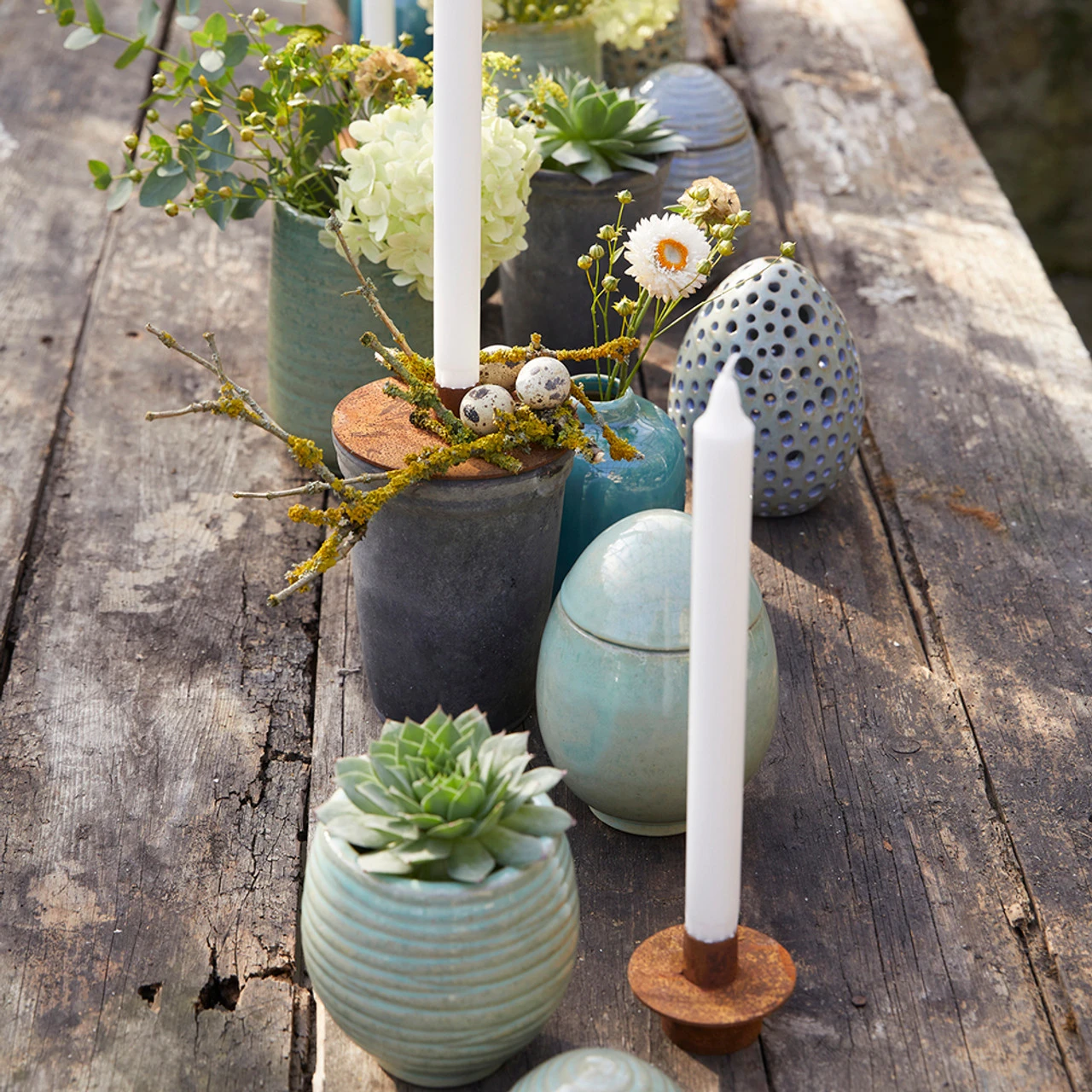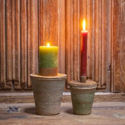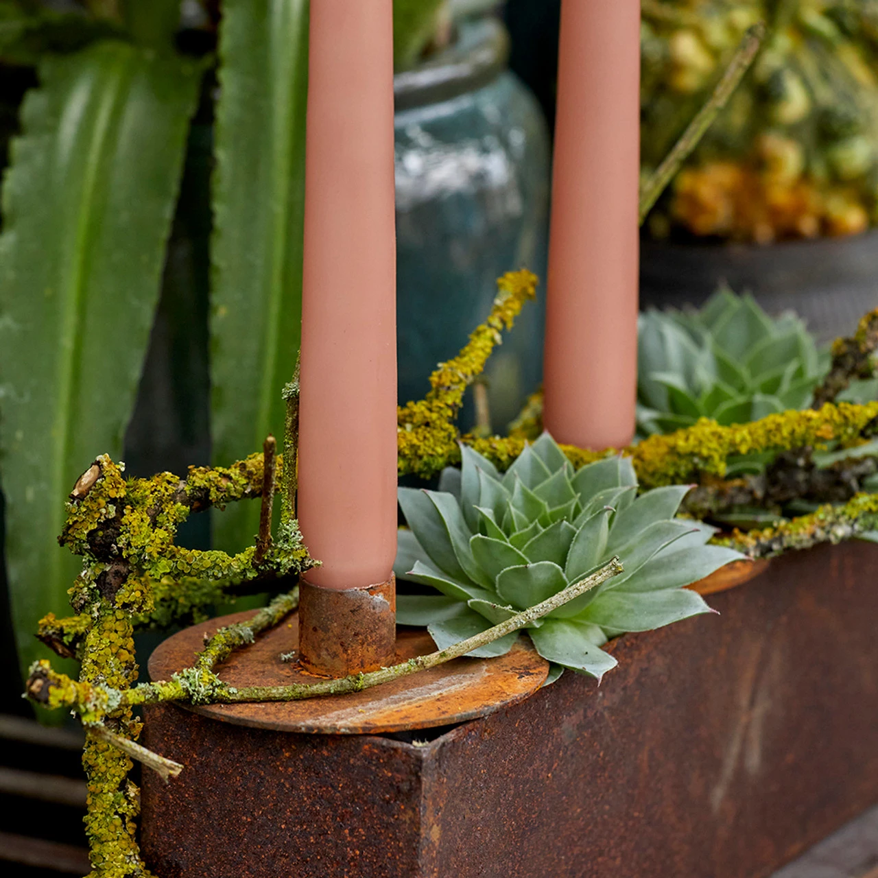 As the name suggests, these candleholders have been designed to fit snugly into plant pots and look great in a line on a table for a summer lunch. The small size fits the Terracotta Pots on our Auricula Stand perfectly, if you want to create a bigger table centrepiece. You can also use these on their own, one side is holds dinner candles, the other side is for a pillar candle.