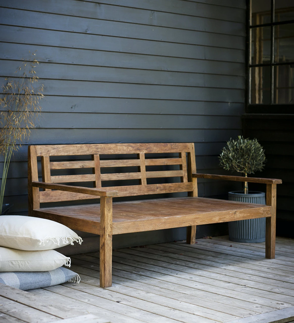 Inspired by deep-seated ornate Indonesian day beds, this is a beautifully simplified design with a striking lined back and full-length arms.