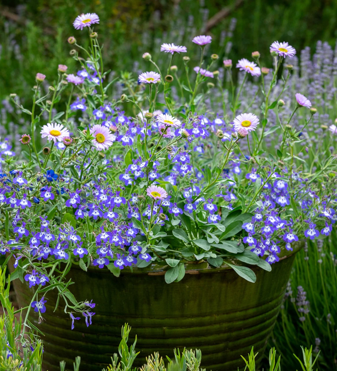 Serenity in a pot, a cool blue pool of calm. If you want a place in the garden which is completely settling and easing away of the rest of life, this is the most calm-like of combinations.