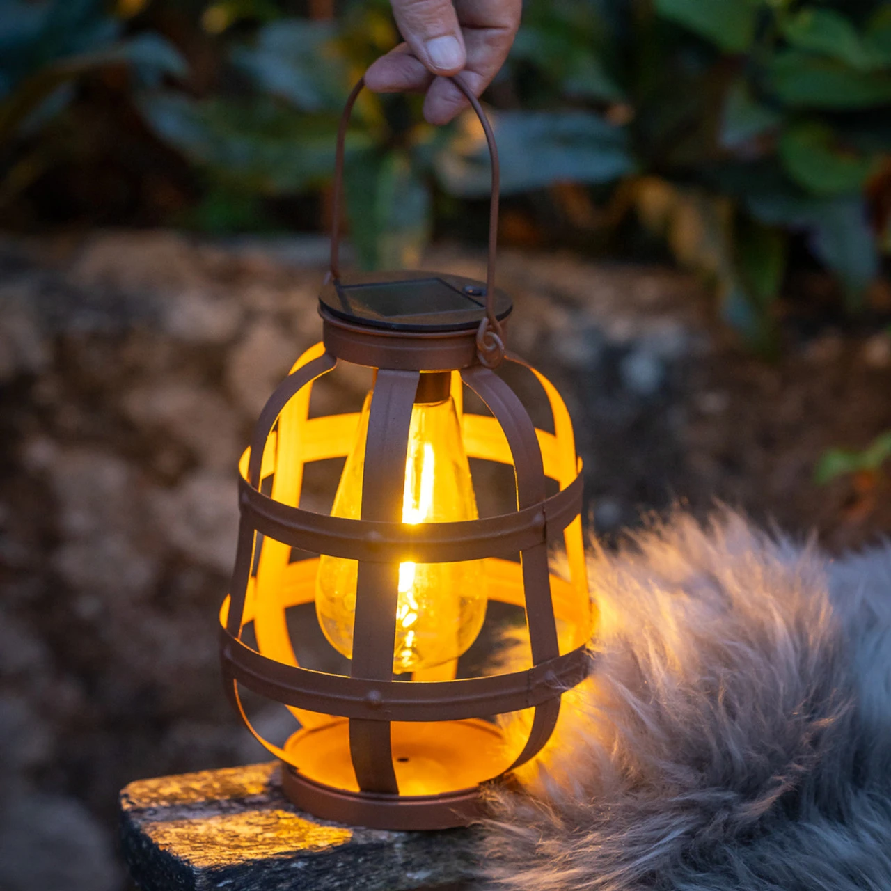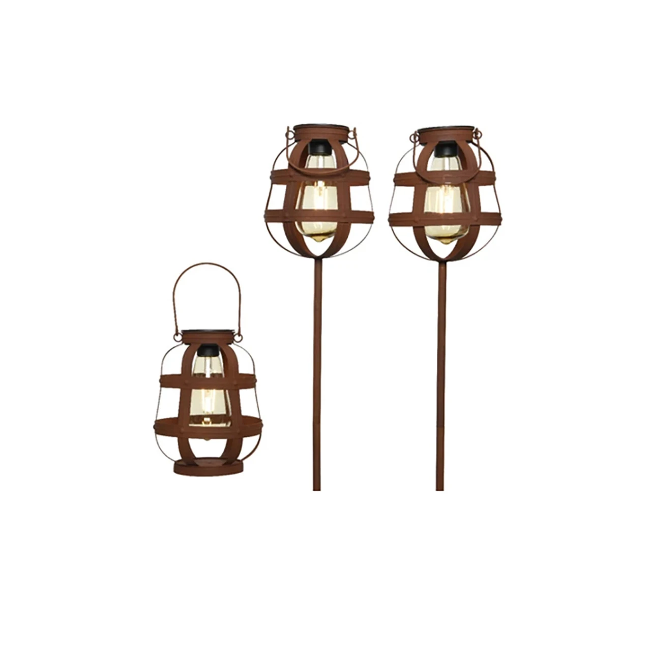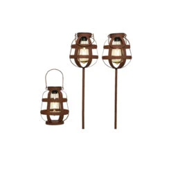 Add a rustic look to your garden with these solar lanterns. The set includes 1 hanging lantern and 2 stake lanterns.