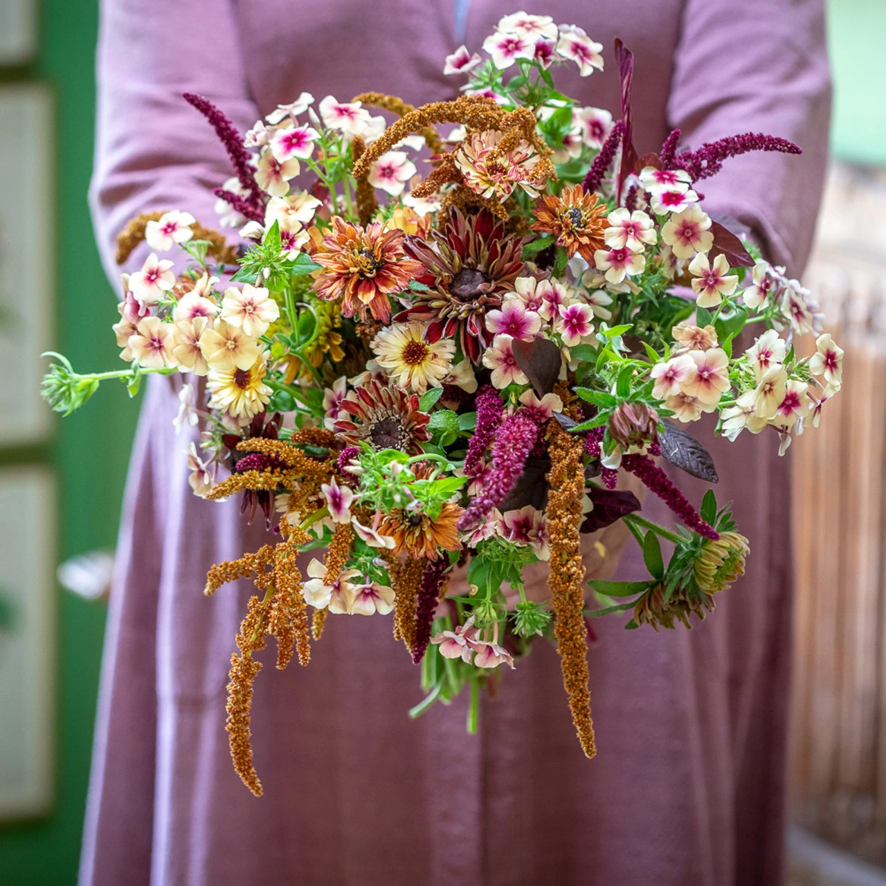 I’m so pleased that the amaranth family are having a renaissance and are very fashionable. Every cutting garden or small, intensive cut flower patch I visited last summer had amaranth as their late summer and autumn crowning glory. Combined here with long and late performers, phlox, rudbeckia and a late sowing of Calendula ‘Sunset Buff’, this makes a gentle but sophisticated cut-and-come-again combination.