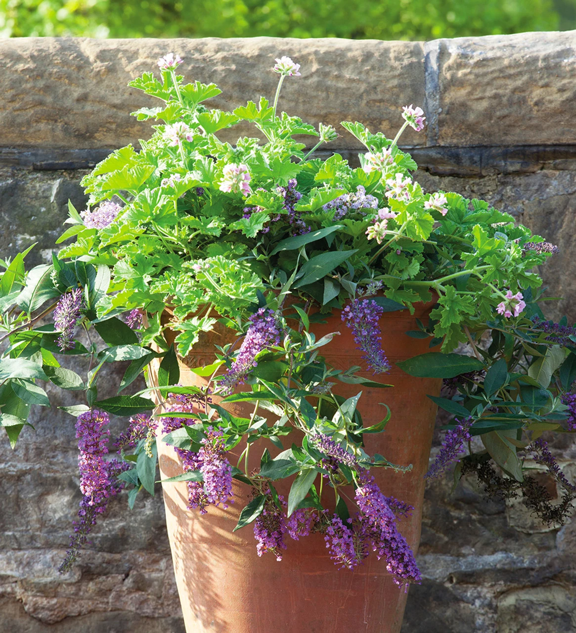 This is the perfect trio in a pot, with a thriller (Pelargonium ‘Attar of Roses’), a spiller (Buddleia ‘Dreaming Purple’) and a filler (Heliotrope ‘Midnight Sky’), to give you a scented spot anywhere sunny in the garden.