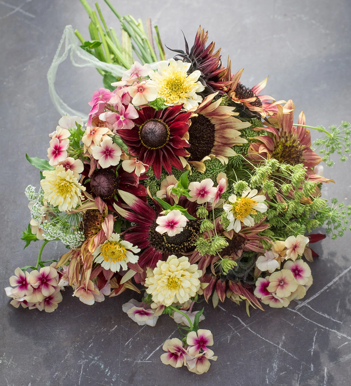 I love this faded, vintage palette including new generation phlox, sunflowers and zinnias joining classic Ammi majus and rudbeckias to create this wallpaper-like, cut flower pattern collection.