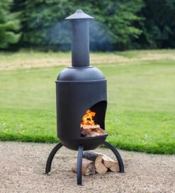A handsome, modern take on the traditional chimenea. The fire bowl has a galvanised grill to set the wood on, raising it off the ashes whilst the tall chimney draws the smoke out and away from the seating area.