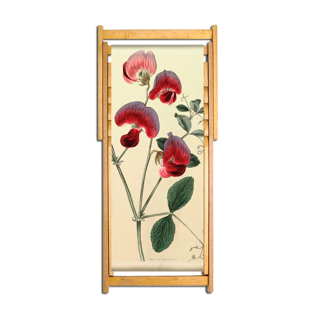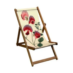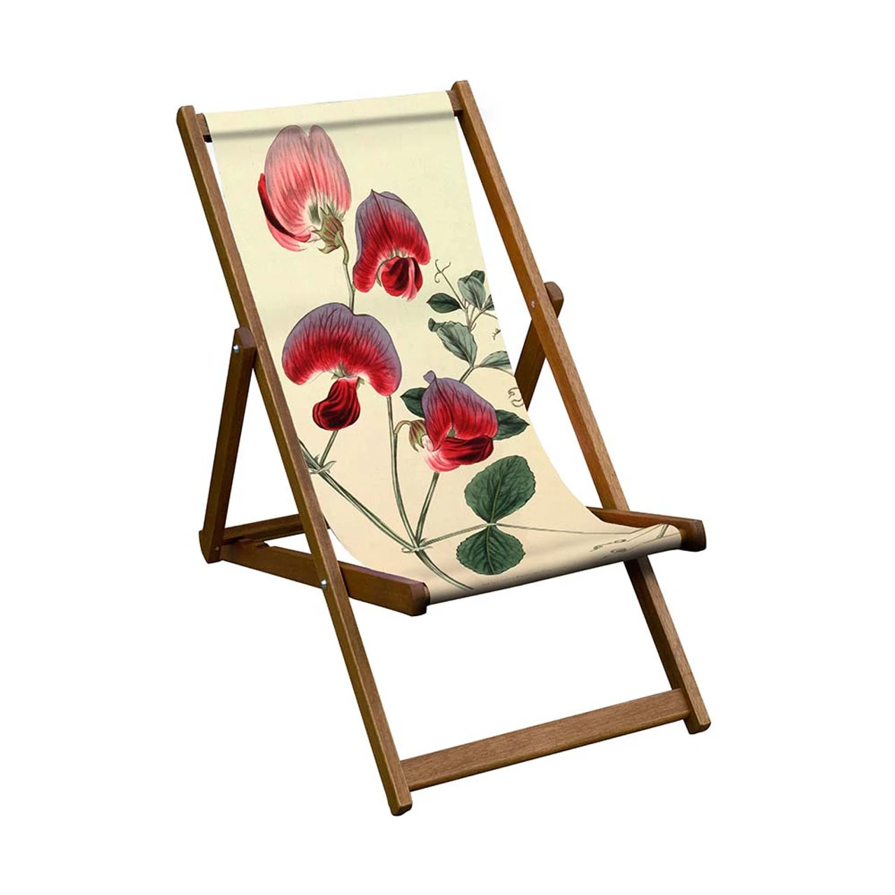 Each sturdy frame is handmade with care in the UK, from solid birch wood treated with a protective oil. The sling is made from very hard-wearing sail cloth, with a beautiful, perennial sweet pea print, taken from a hand-coloured copperplate engraving of a botanical illustration by Sydenham Edwards, from the William Curtis Botanical Magazine 1790-1800.
