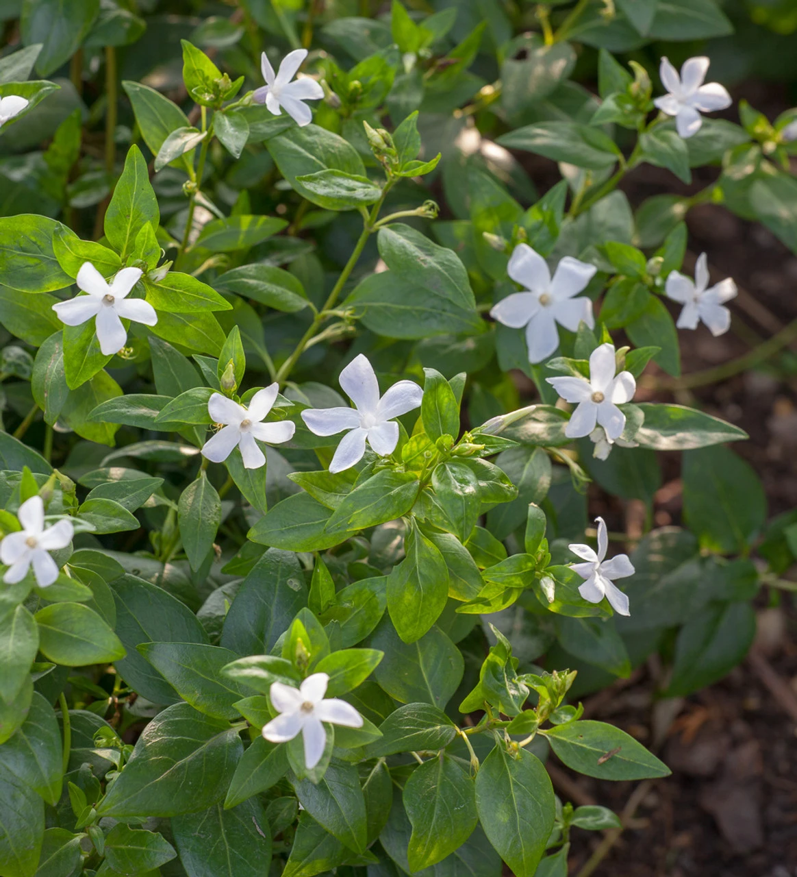 Periwinkles are so useful for brightening up shady spots and smothering the ground with their glossy evergreen foliage. This is the prettiest of them all in pure white.