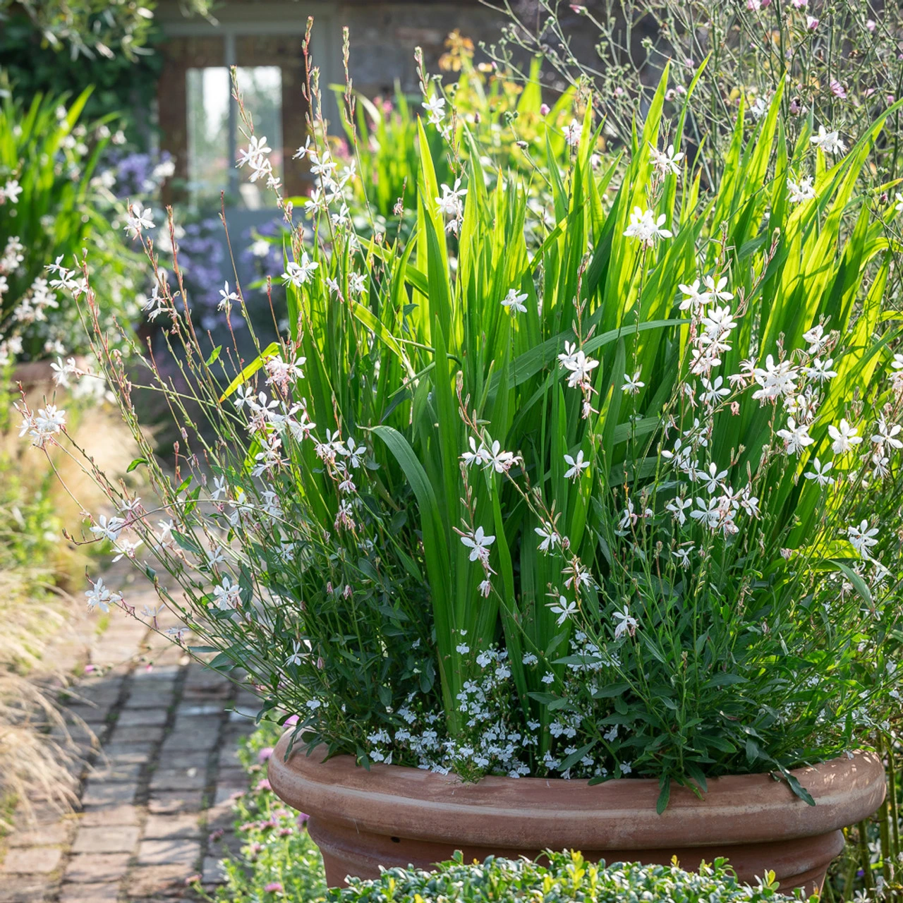 Plant acidanthera corns 15cm deep in a large pot and top with the gaura, with lobelia planted around the edge to cascade down the sides.