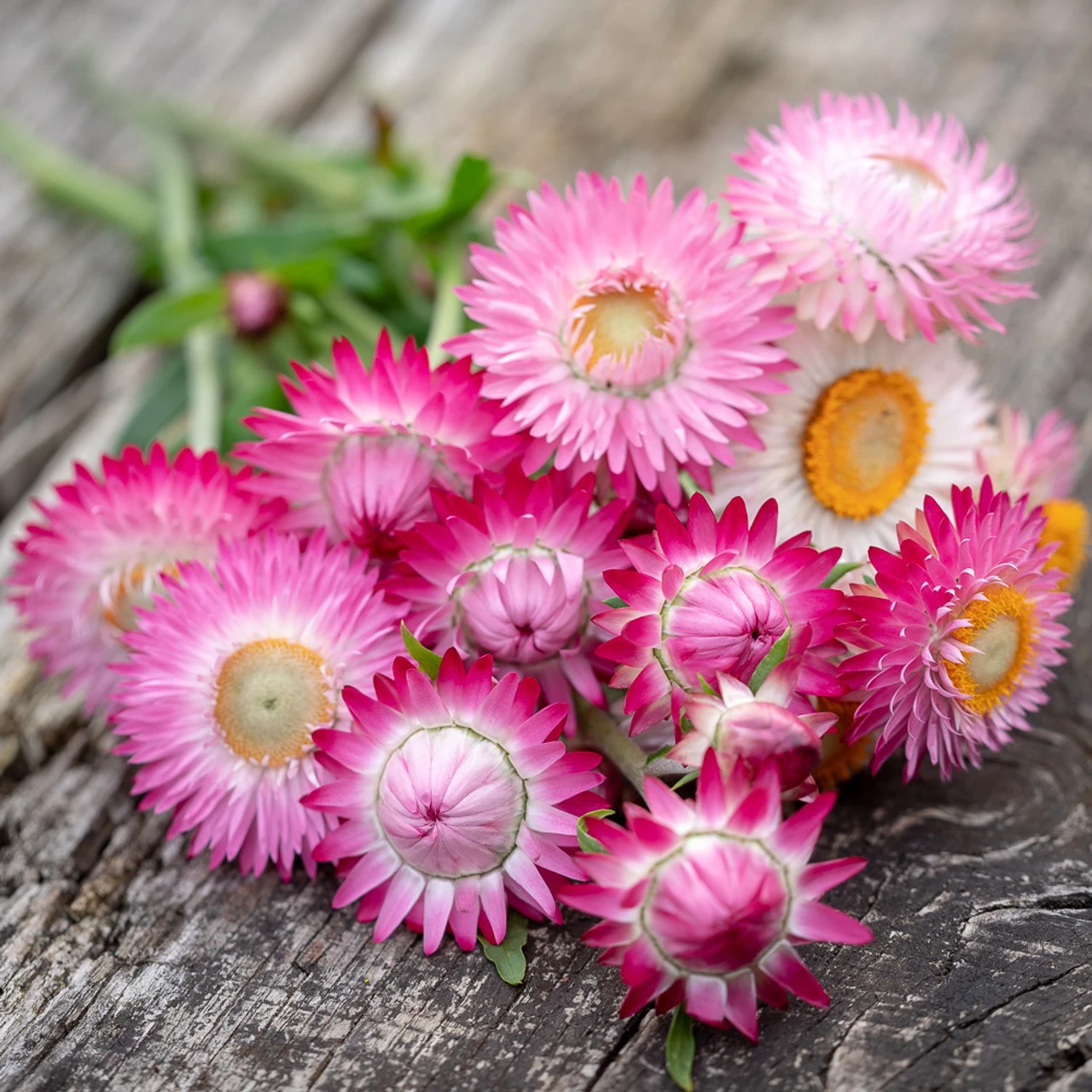 A lovely soft-pink, white-hearted variety of strawflower. The more you pick, the more it grows.